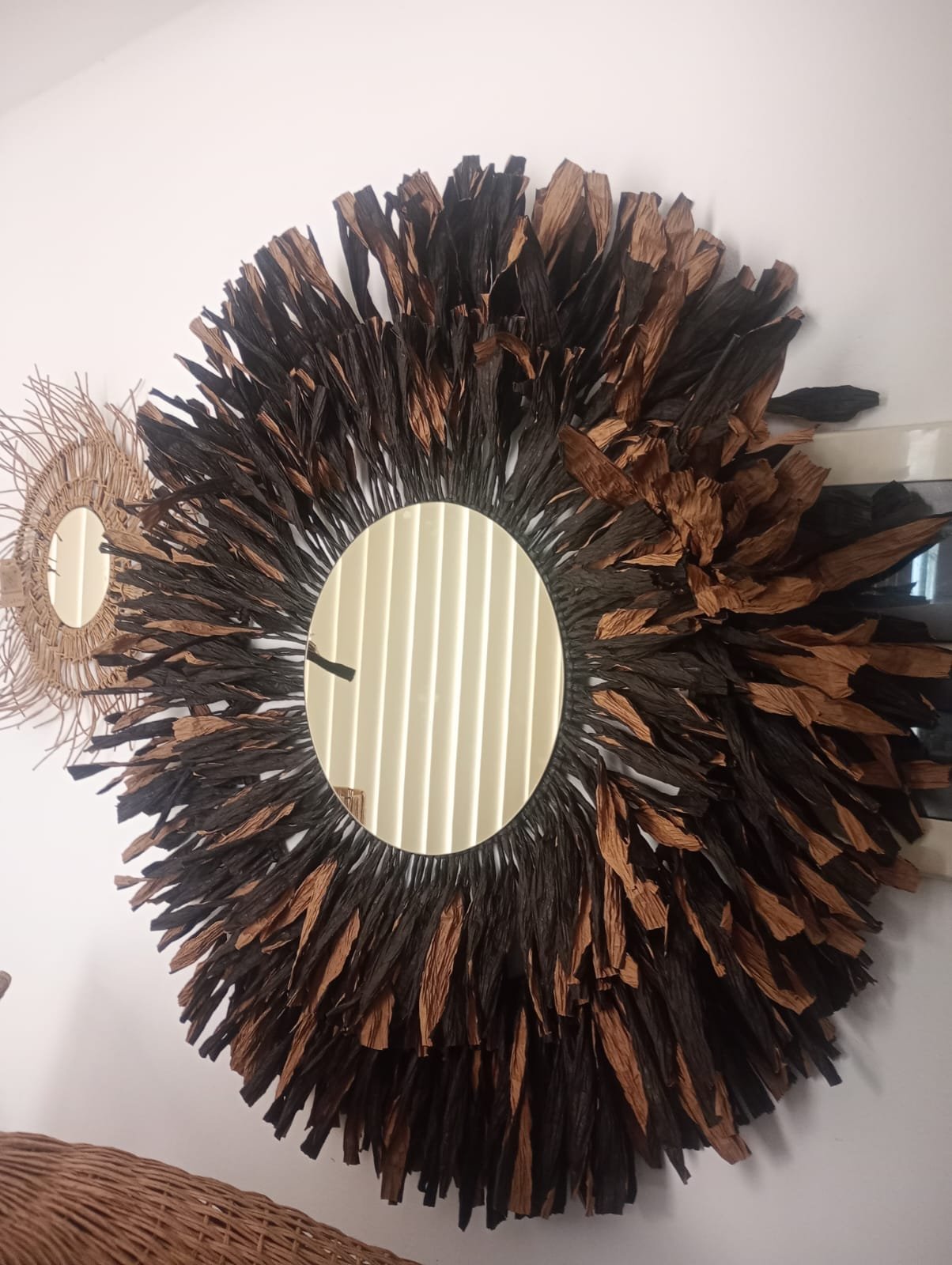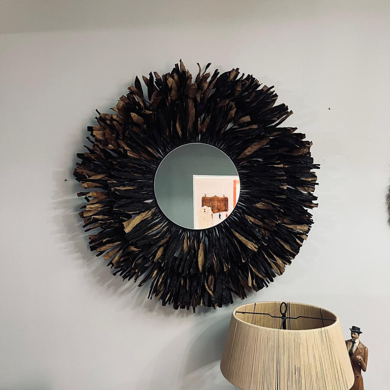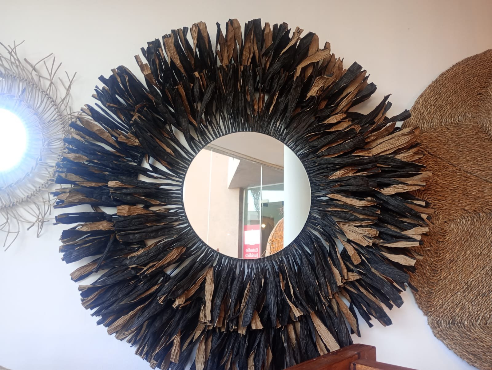 Espejo montado en una estructura de hierro adornado con hilo kraft, brinda serenidad y calidez a tus espacios.