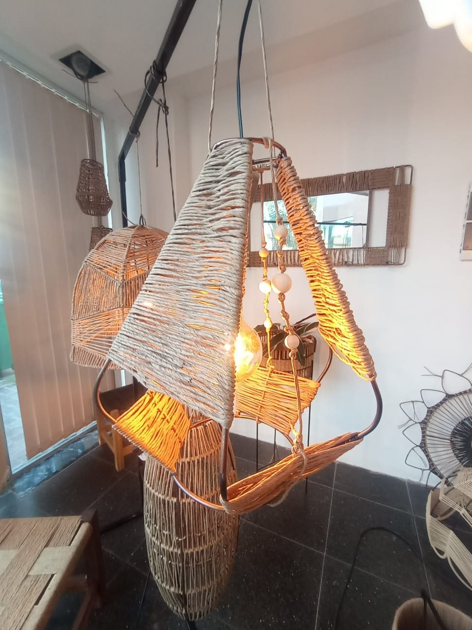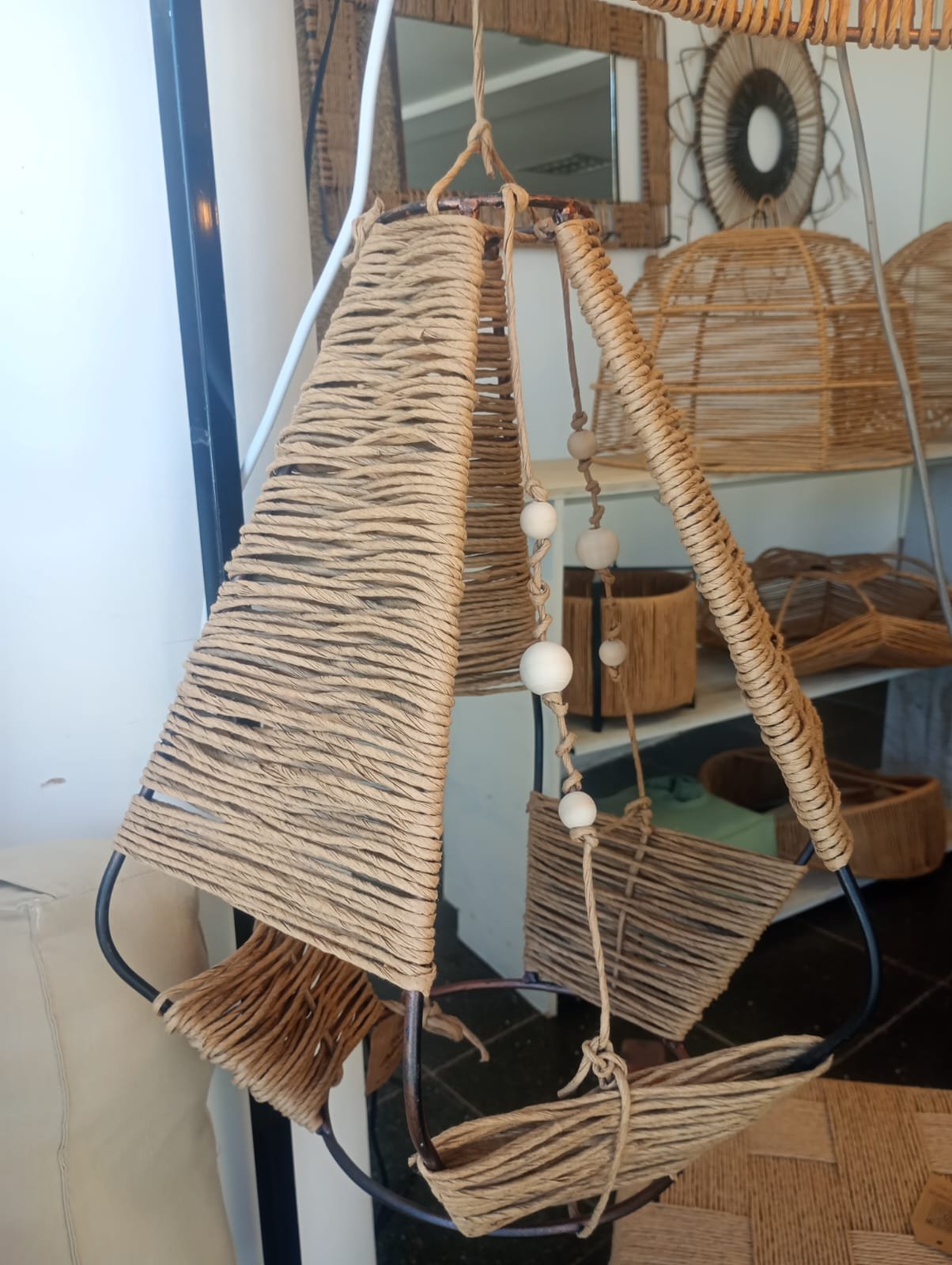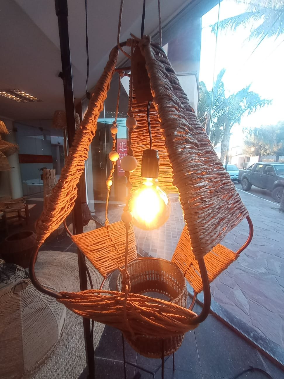 Lámpara elaborada en una estructura de hierro con hilo kraft. Esta lámpara refleja un carácter auténtico y aporta calidez en cualquier ambiente en que se encuentre.