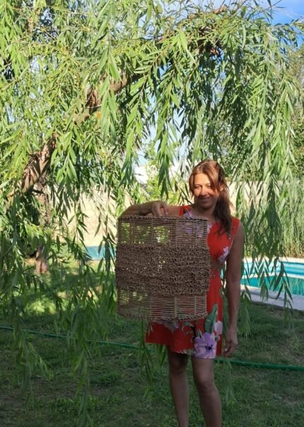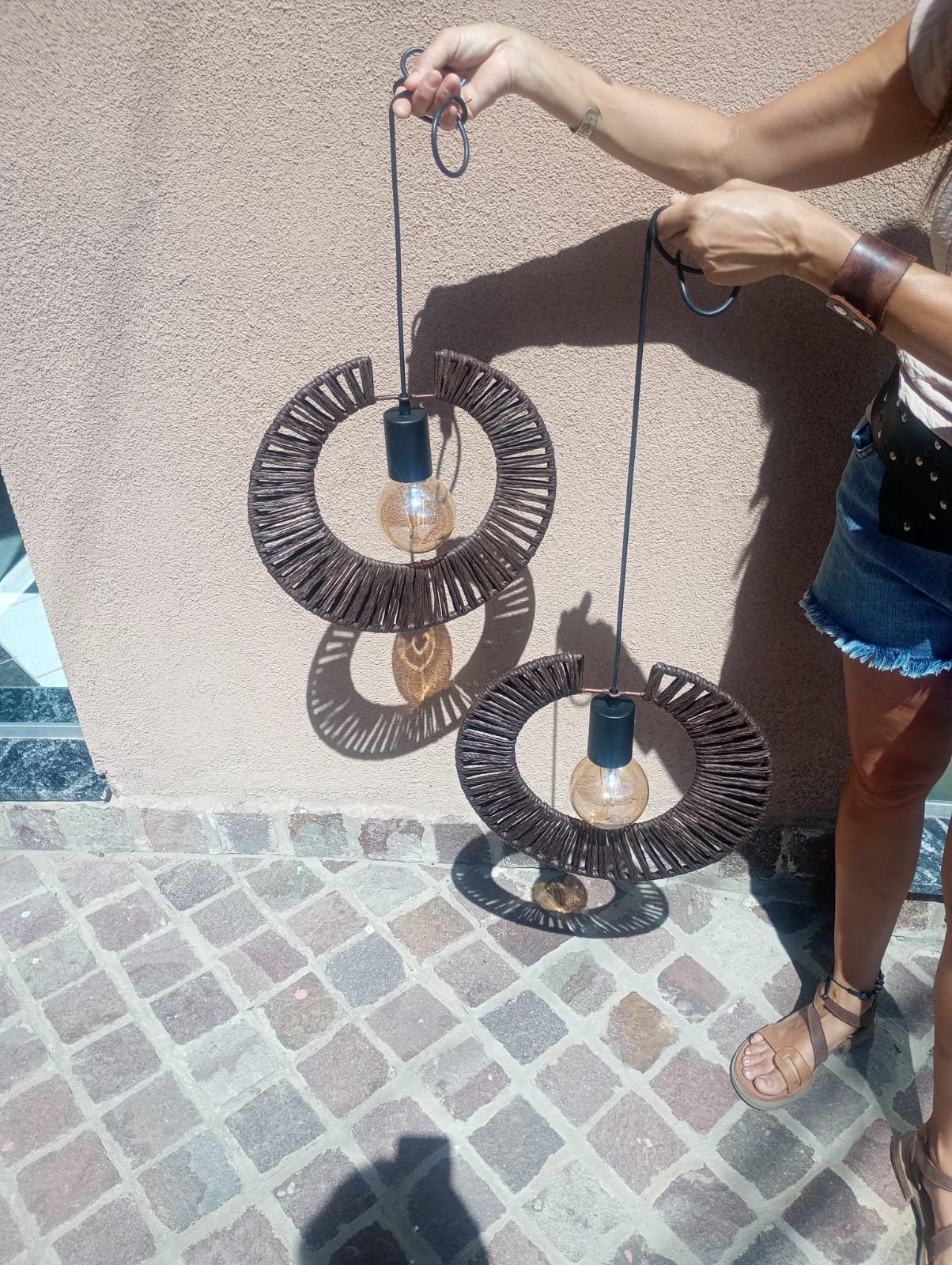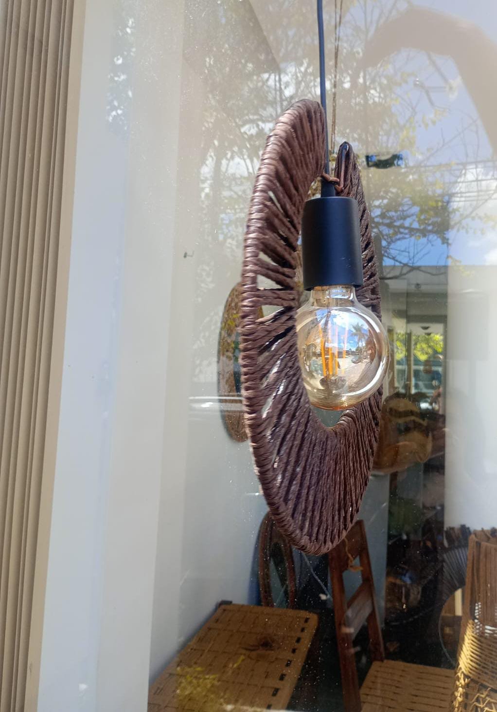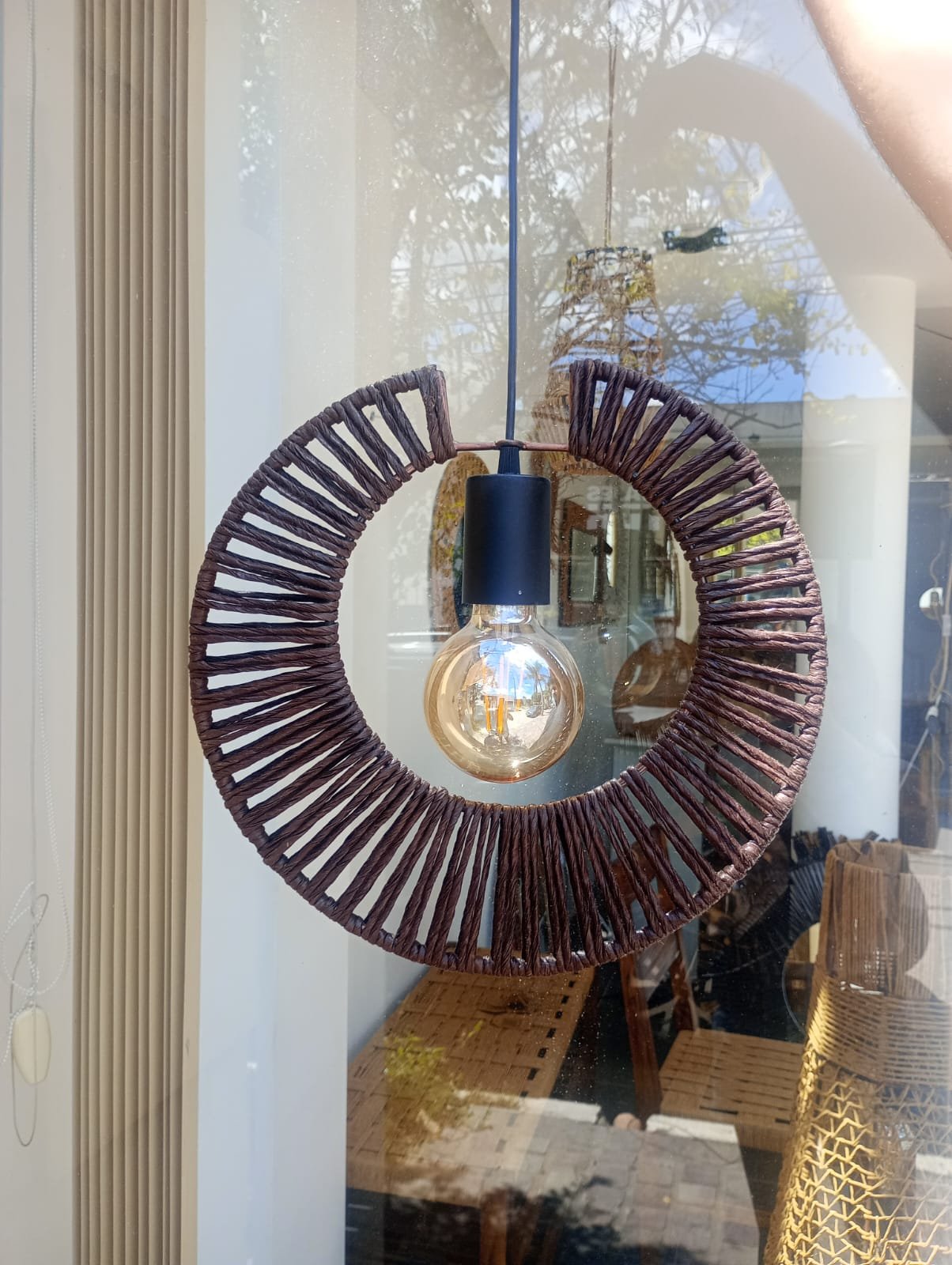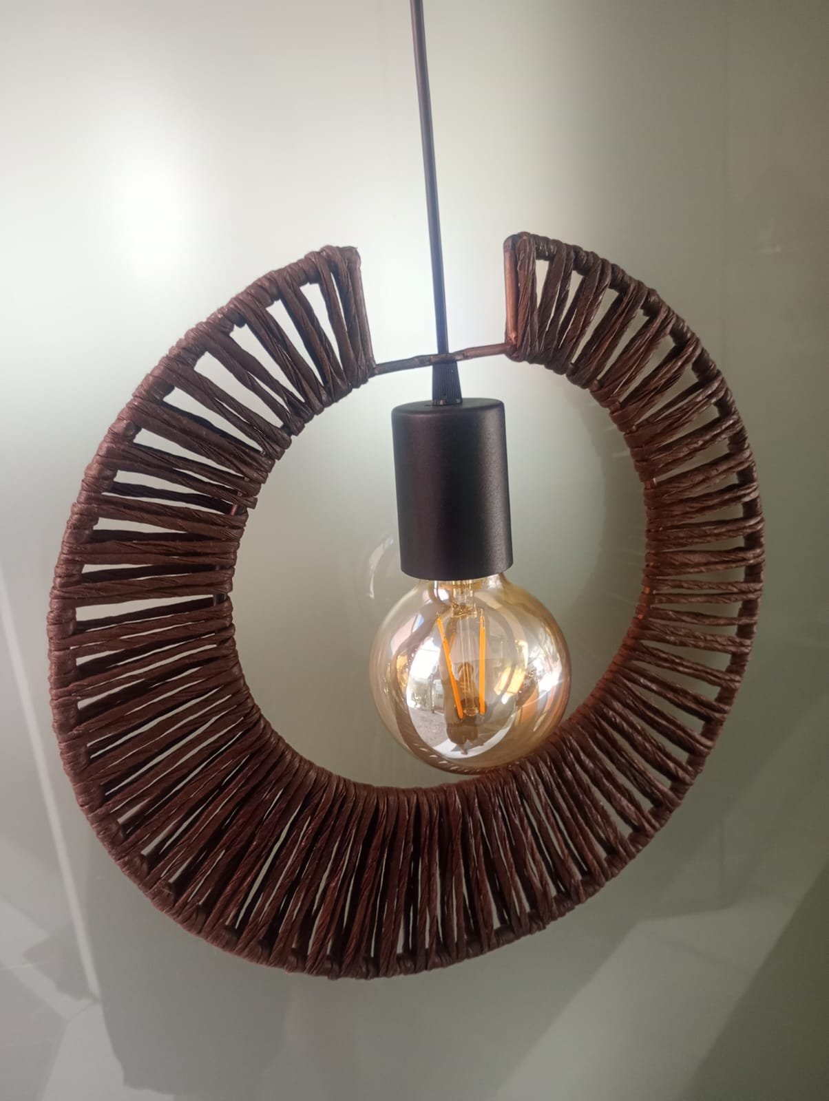 Lámpara elaborada en una estructura de hierro con hilo kraft, de diseño simple, costo accesible, y adaptable pues se destaca en cualquier ambiente.
