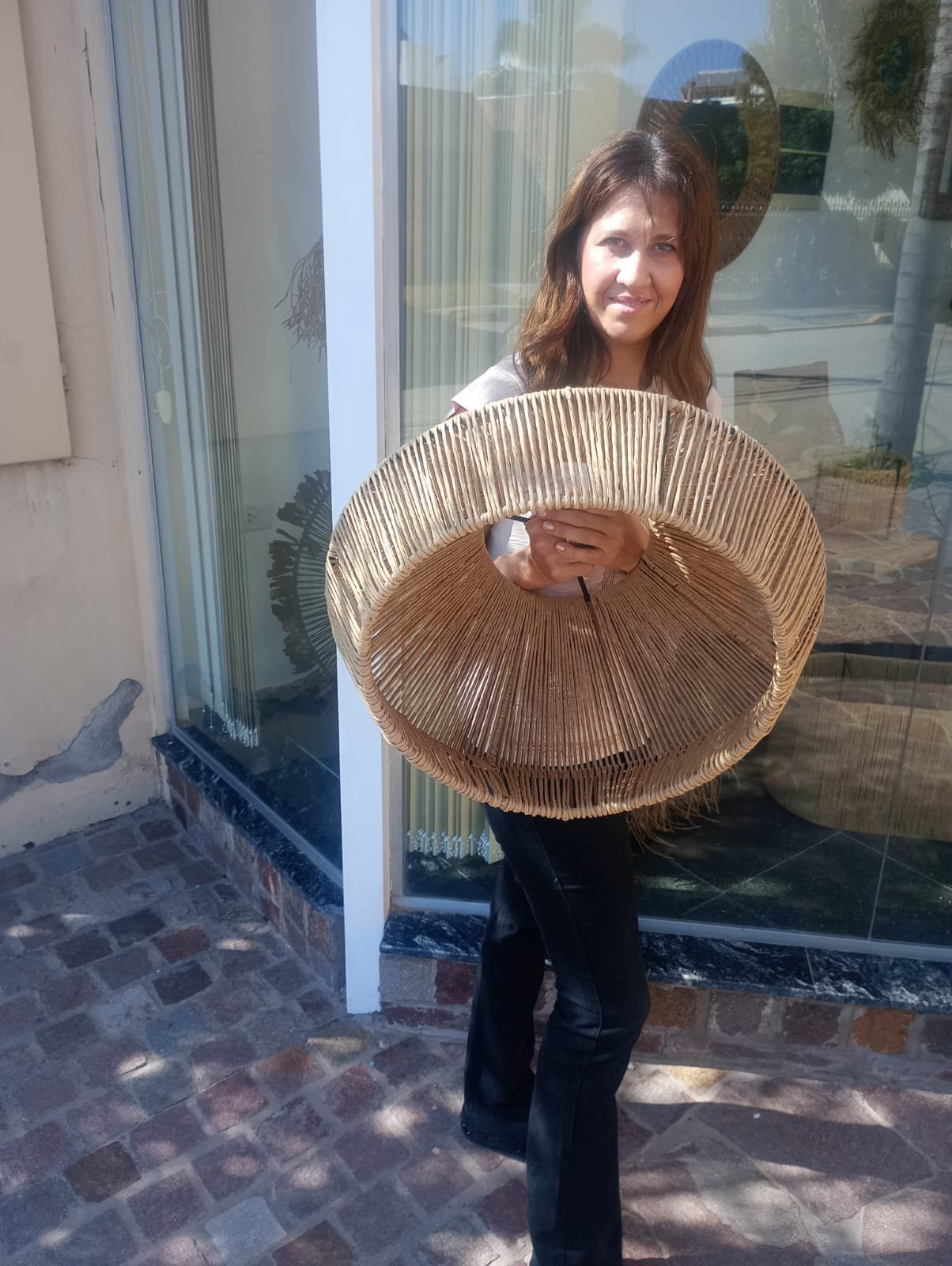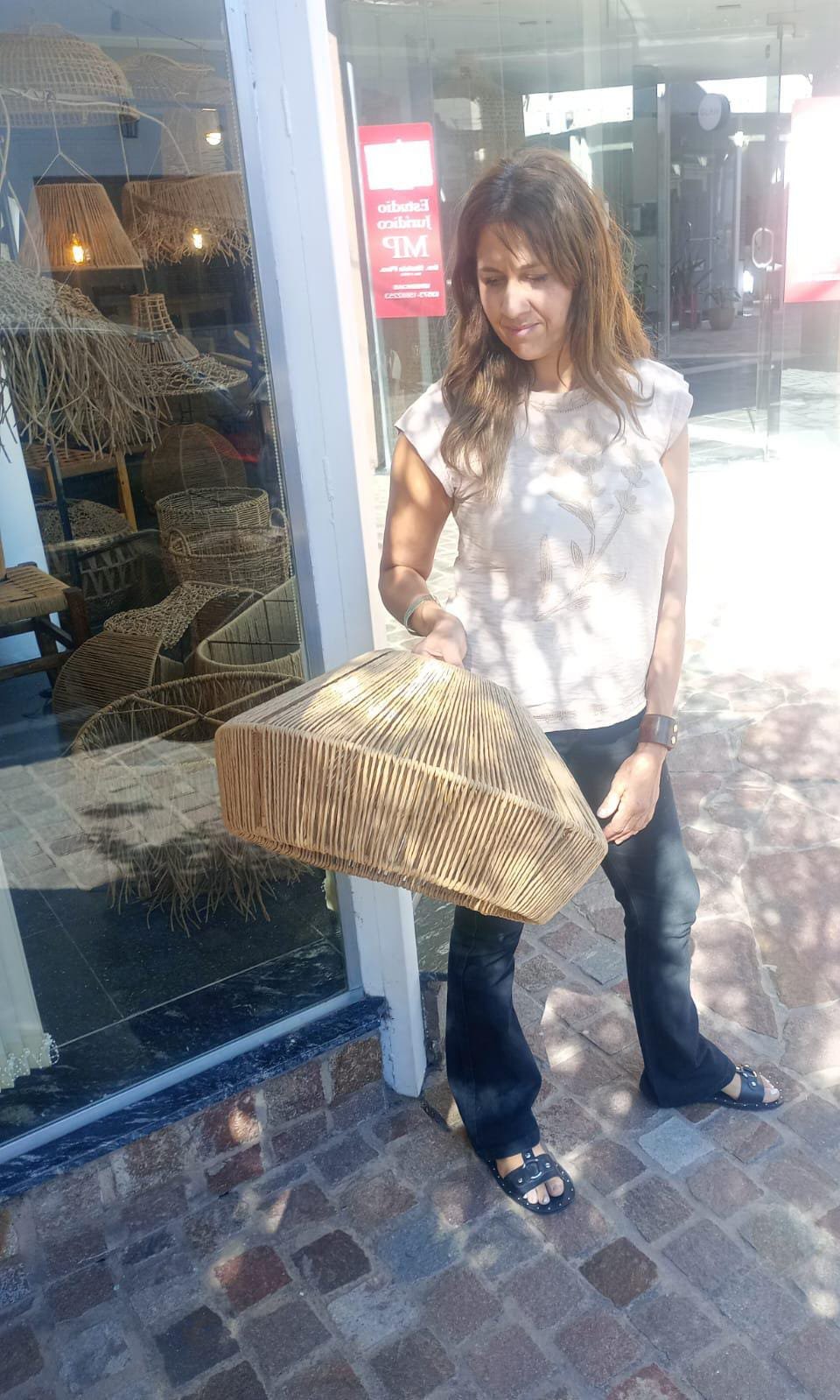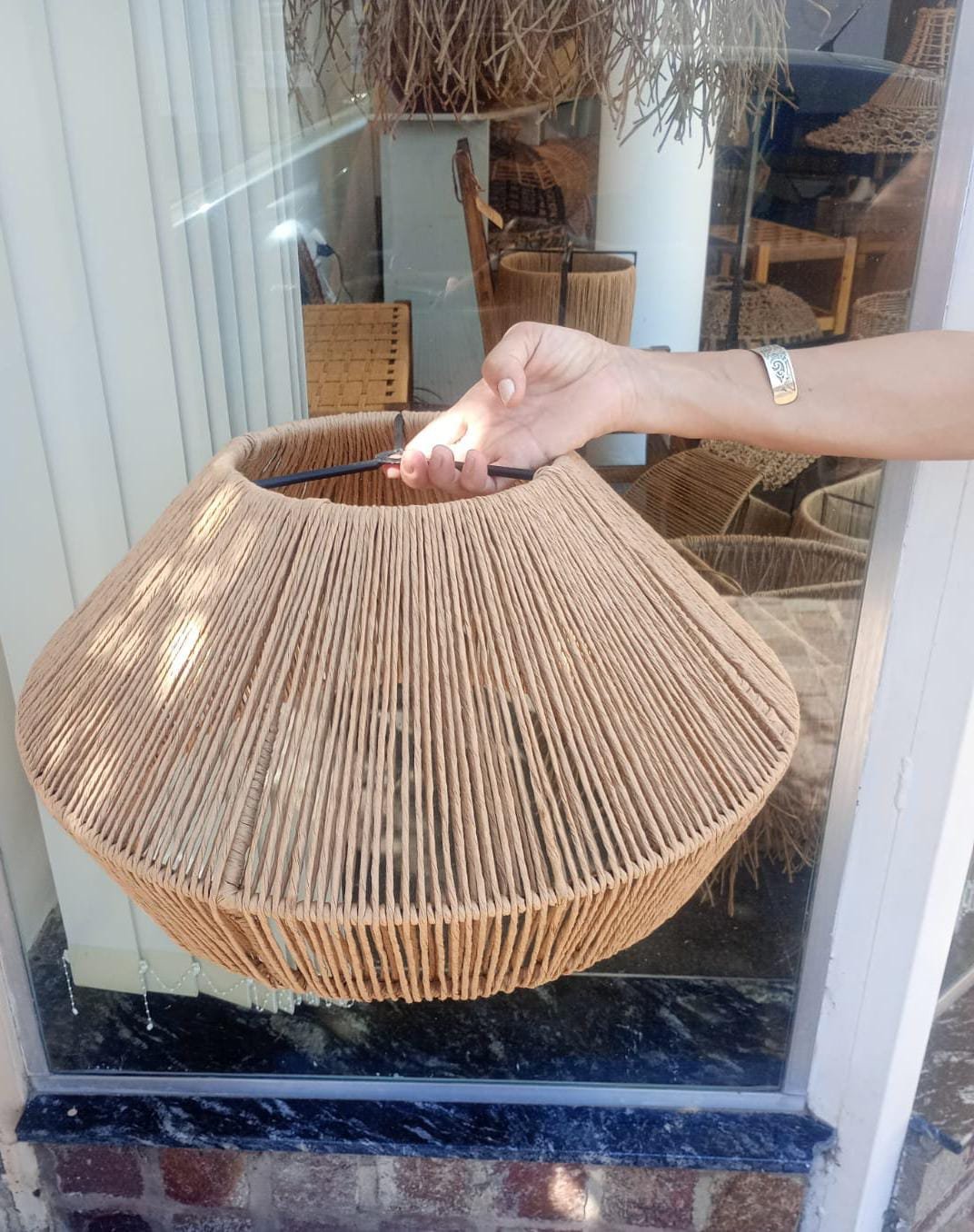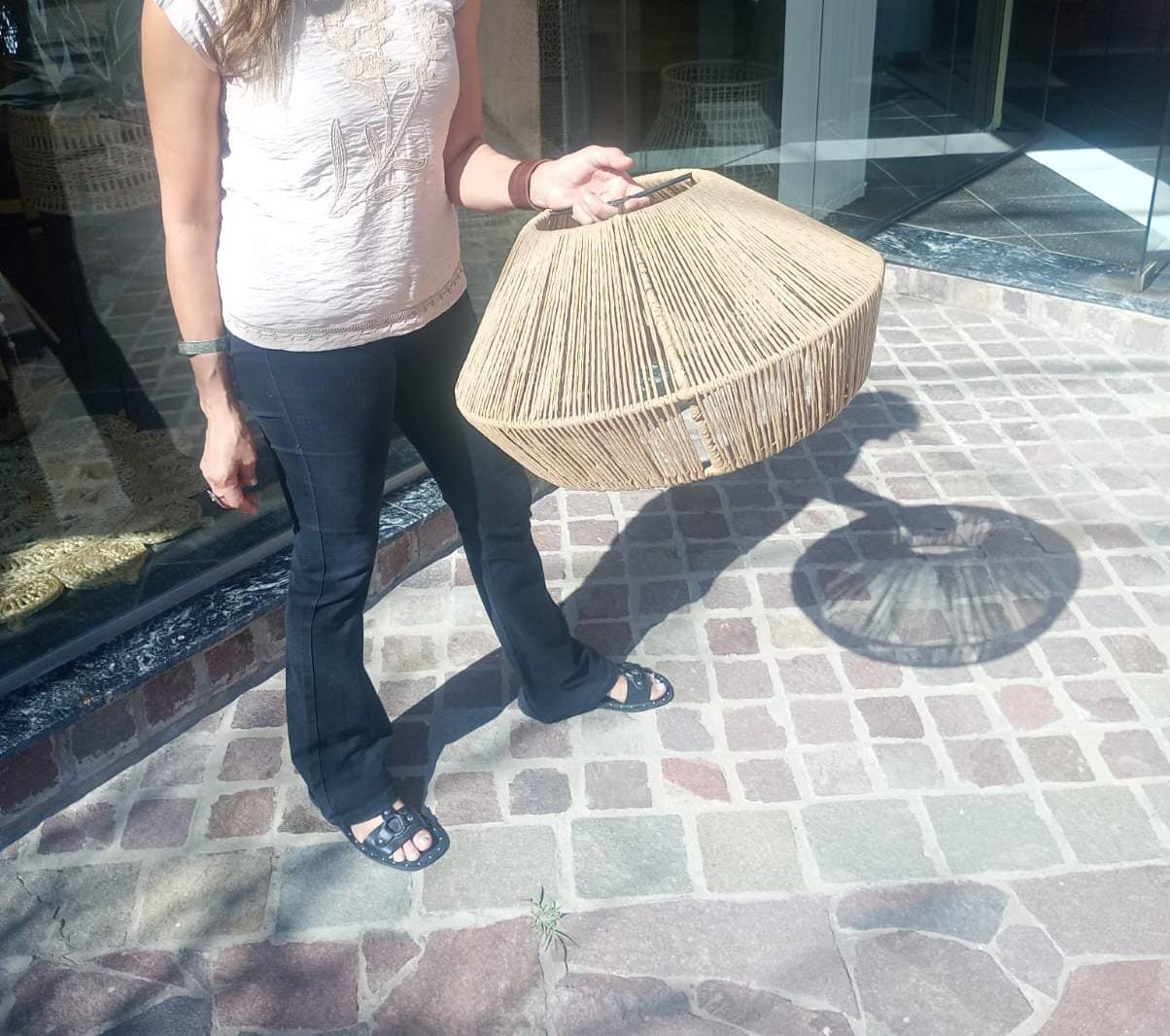 Lámpara elaborada en una estructura de hierro con hilo kraft.