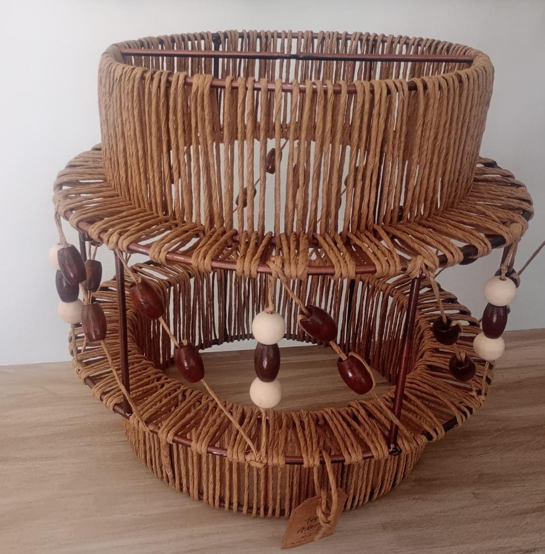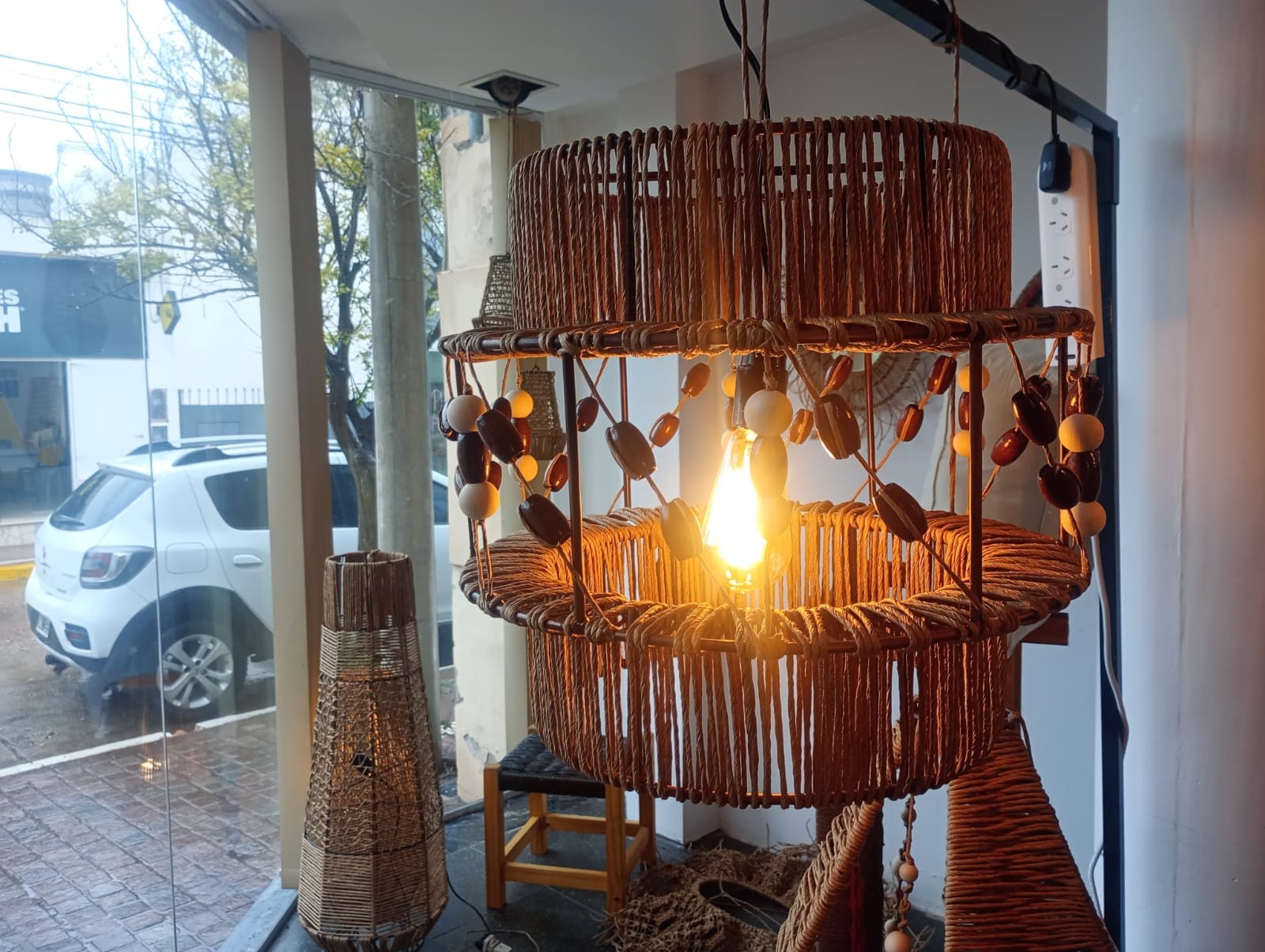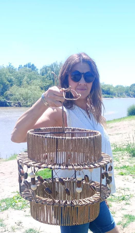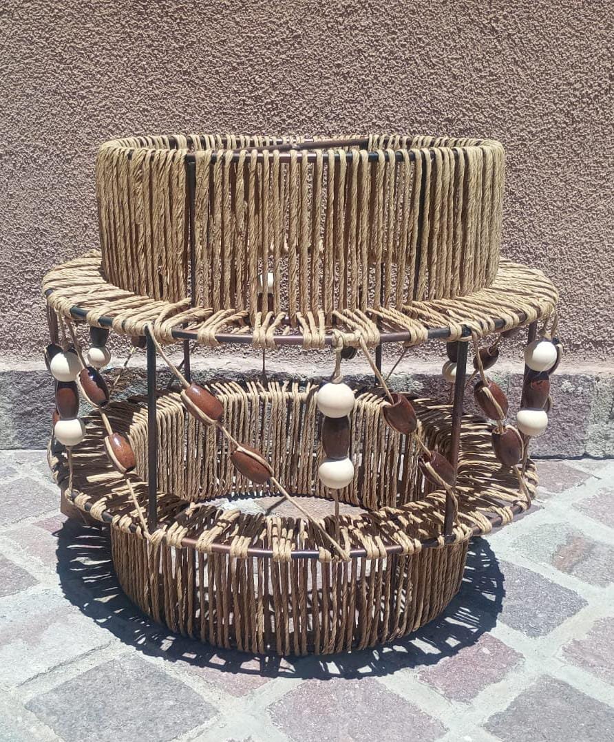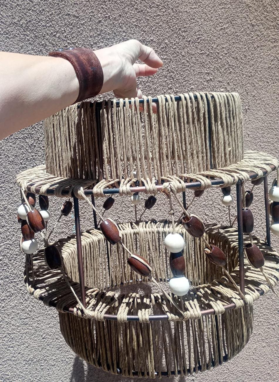 Lámpara elaborada en una estructura de hierro, hilo kraft y esferas de madera. Los adornos de madera le dan un tono rústico que hace que la lámpara quede muy bien en espacios donde se busca calidez o bien puede crear contraste con espacios fríos.