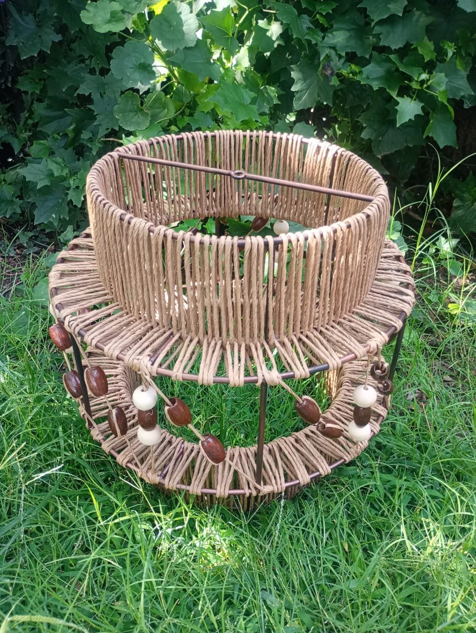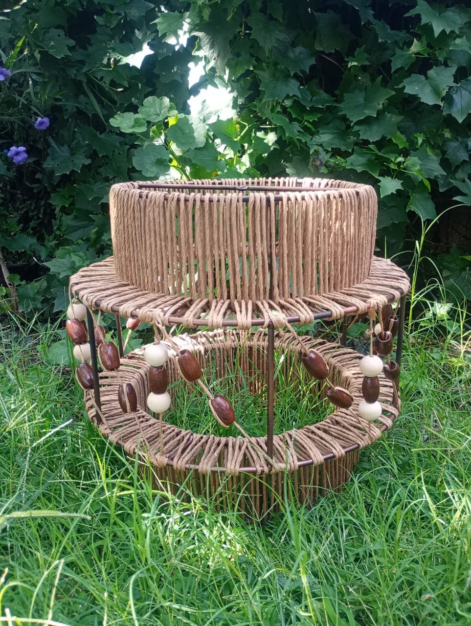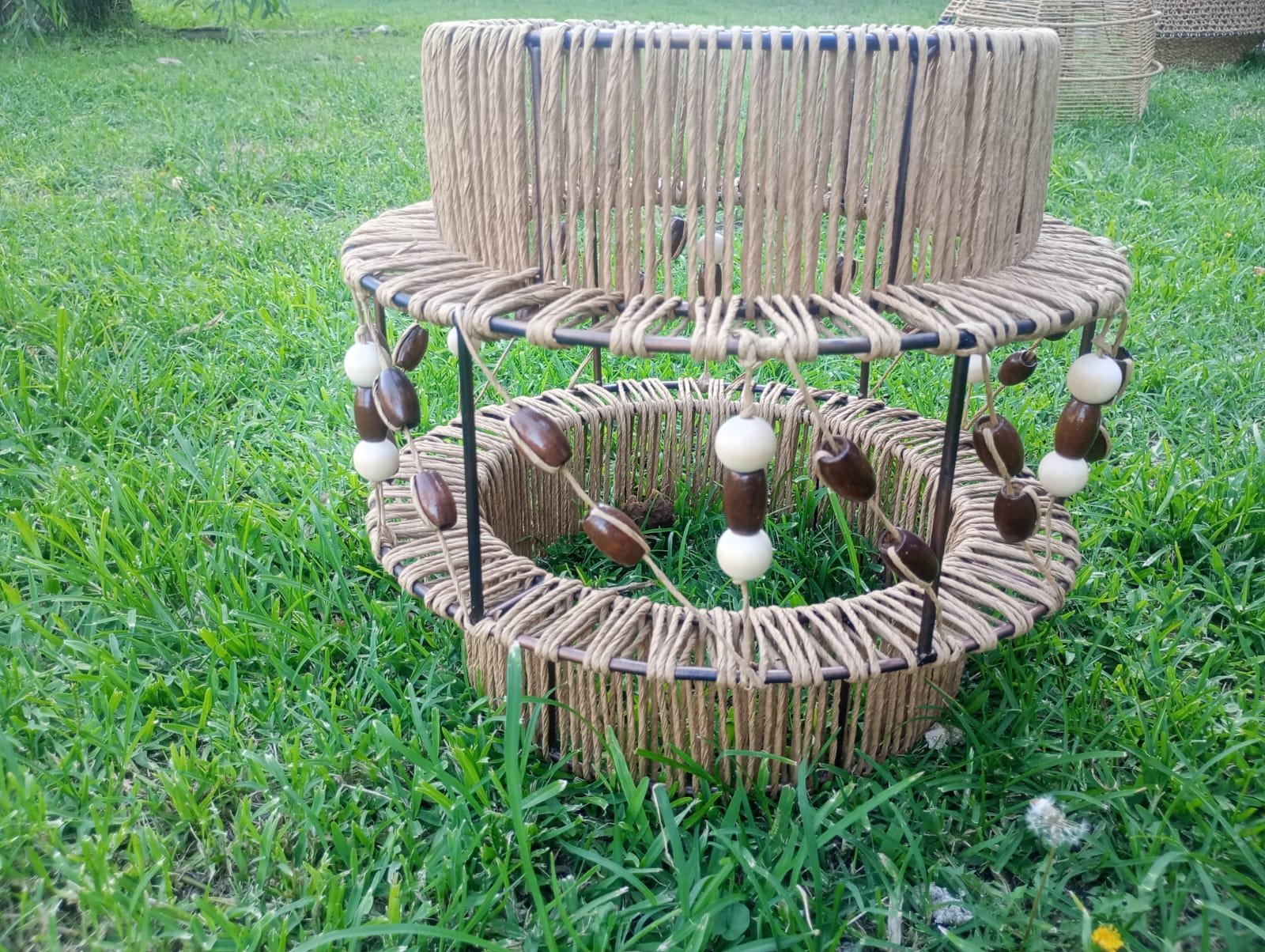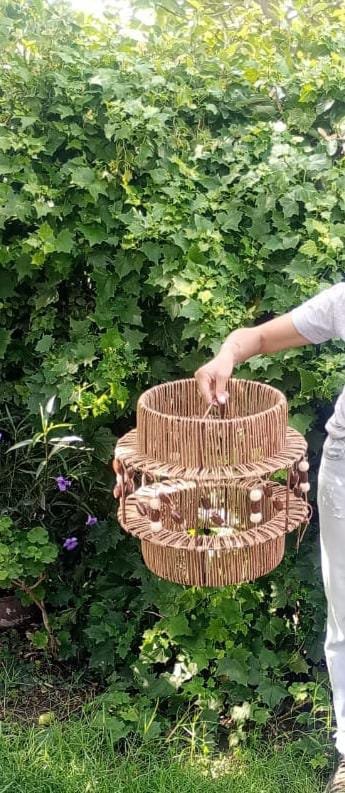 Lámpara elaborada en una estructura de hierro, hilo kraft y esferas de madera. Los adornos de madera le dan un tono rústico que hace que la lámpara quede muy bien en espacios donde se busca calidez o bien puede crear contraste con espacios fríos.