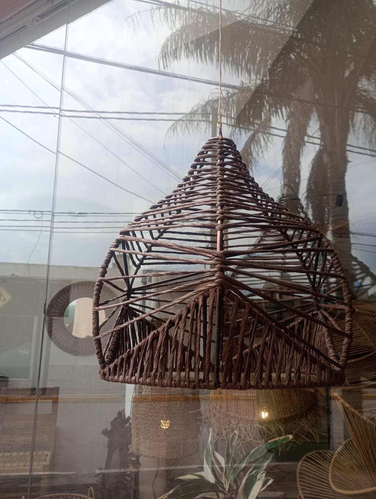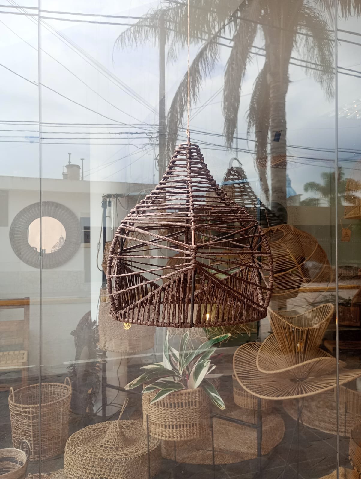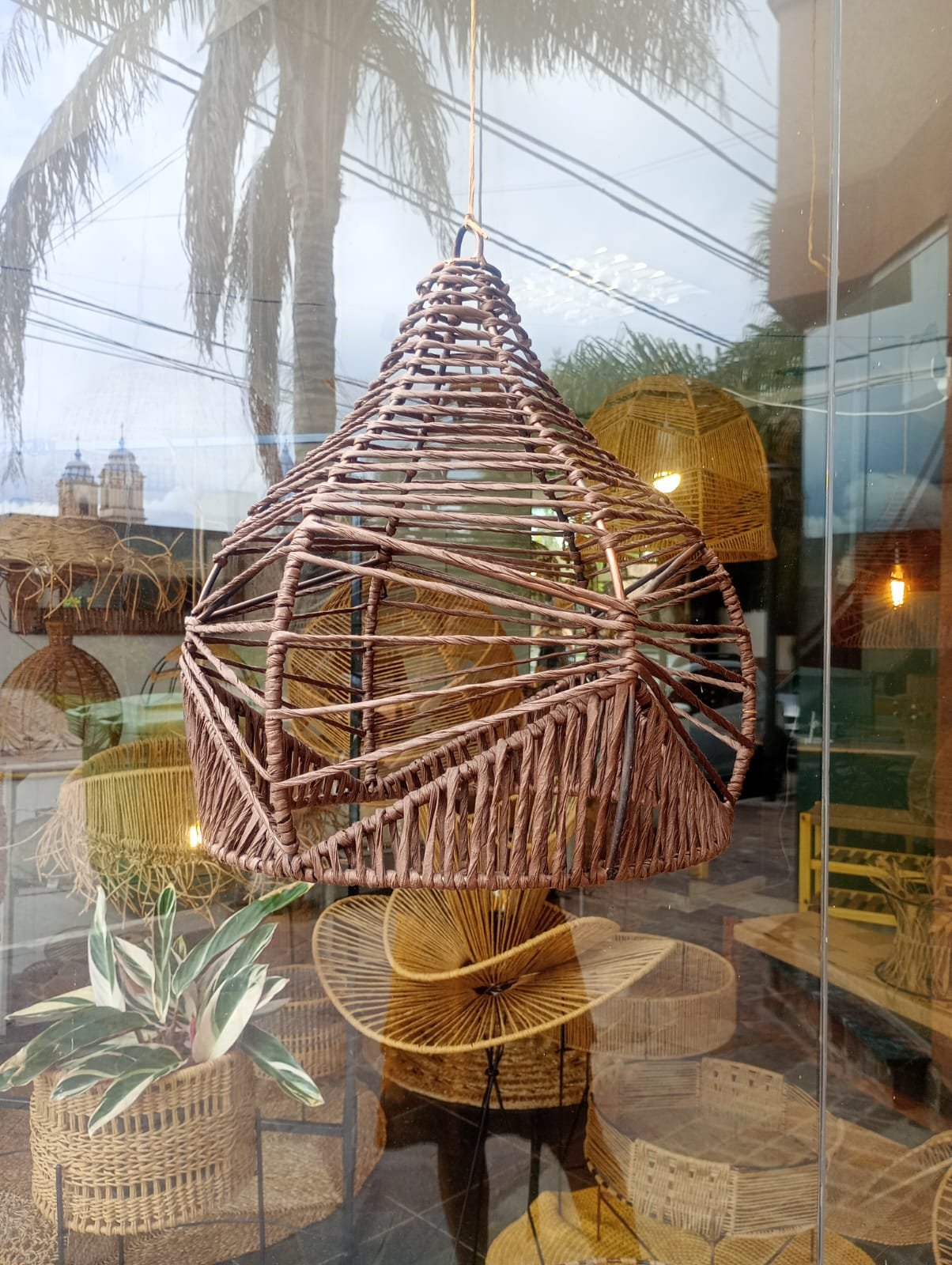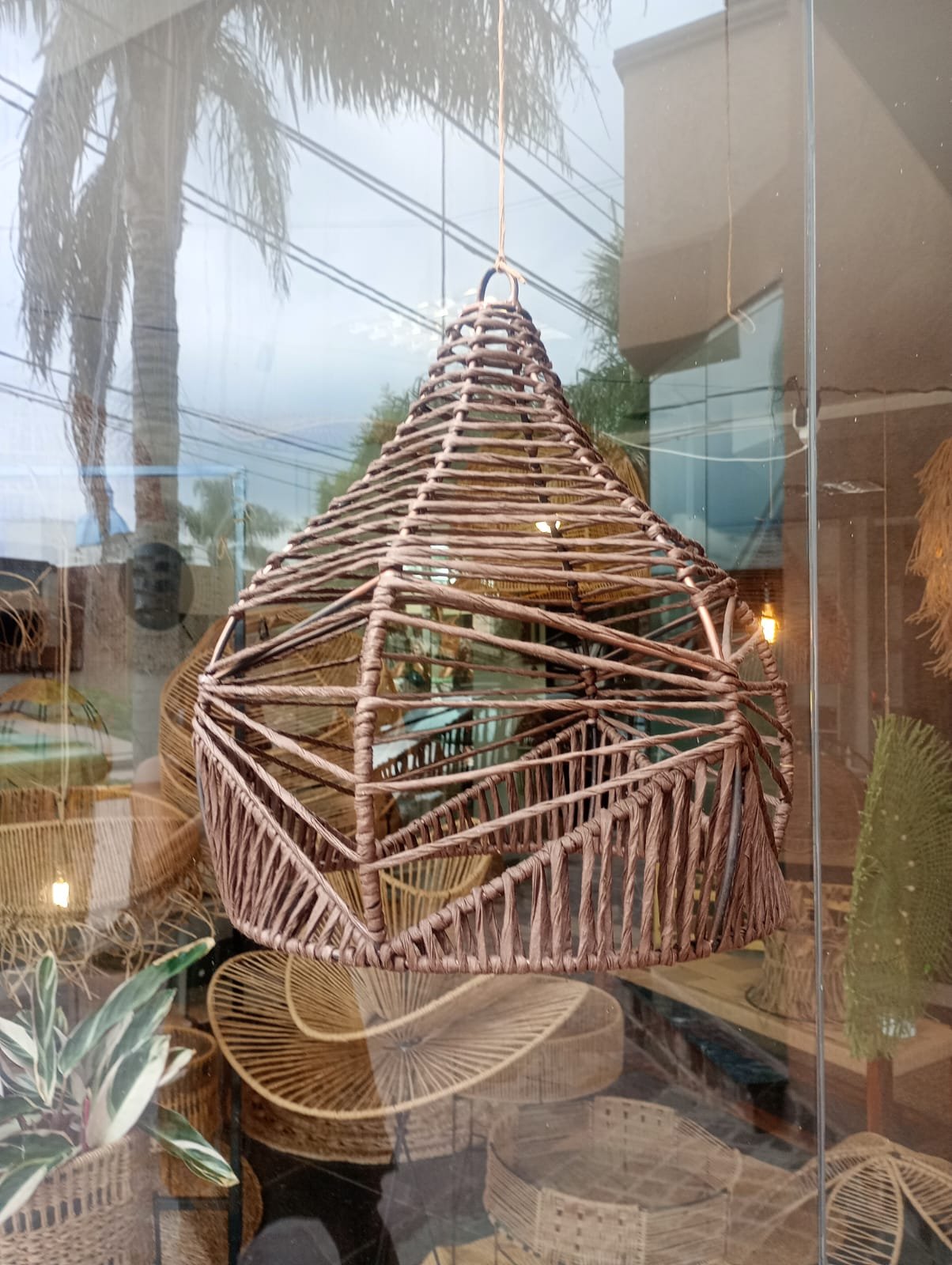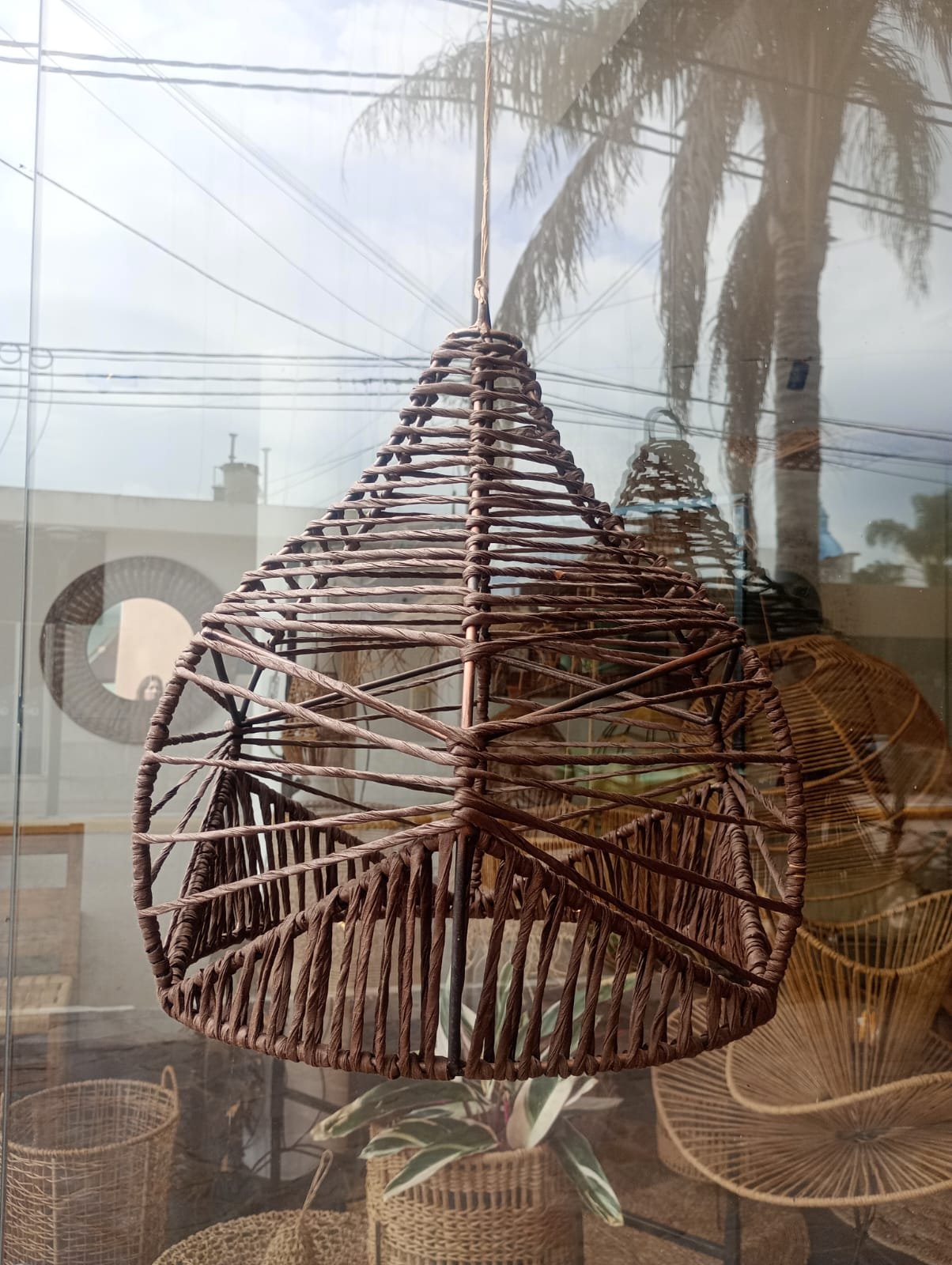 Lámpara elaborada en una estructura de hierro con hilo kraft. Su entramado aporta calidez y elegancia.